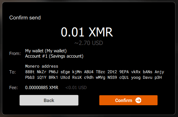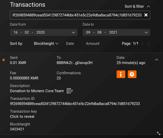 This dialog will also display the Transaction ID (txid), which is a unique identifier for your Monero transaction. Optionally, click on Copy button to copy it to the clipboard. You can enter it on Transactions page or block explorers to see the transaction details. Sometimes a recipient may also ask you to send a transaction ID to verify you’ve sent Monero to them.